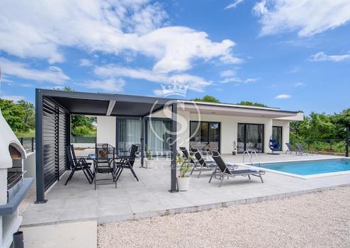 Zum Verkauf steht eine luxuriöse eingeschossige Villa mit Pool und einer gesamten Wohnfläche von 135 m², gelegen in ruhiger und grüner Umgebung von Kanfanar, nur etwa zwanzig Kilometer von Rovinj, seinen Stränden und der lebendigen Altstadt entfernt.