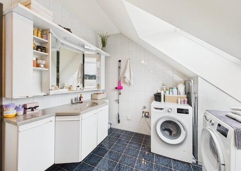 Die größere Einheit mit knapp 94 m² verfügt über einen großzügigen und hellen Wohn-Essbereich, ein Schlafzimmer, ein separates WC, einen Abstellraum sowie ein großes, voll ausgestattetes Badezimmer mit Fenster, Badewanne, Dusche, Pissoir, Bidet, WC sowie Waschmaschinenanschluss.