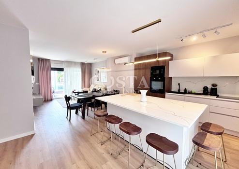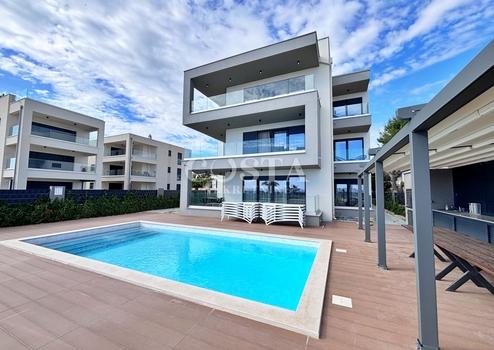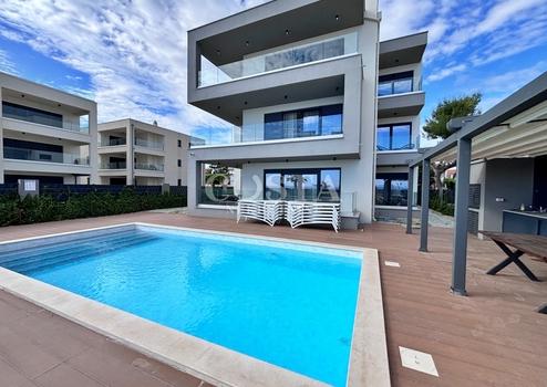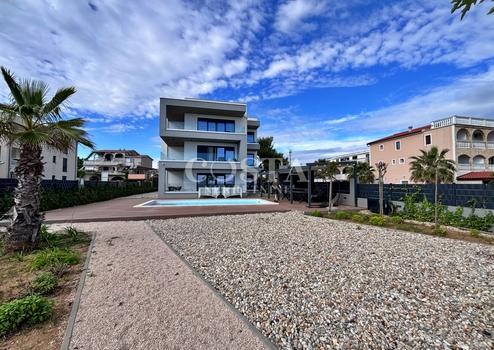 Auf der Insel Vir in der Gespanschaft Zadar steht eine luxuriöse Apartmentvilla mit Pool zum Verkauf. Das Anwesen mit einer Wohnfläche von 457 m² befindet sich auf einem 1001 m² großen Grundstück. Es besteht aus einem Erdgeschoss und zwei Obergeschossen mit vier luxuriös ausgestatteten Apartments. Jedes Apartment verfügt über ein Wohnzimmer, eine Wohnküche, zwei Schlafzimmer mit Bad, ein Gäste-WC und eine Terrasse. Im Erdgeschoss befinden sich neben einem Apartment ein Wellnessbereich mit Sauna und Fitnessgeräten, ein Spielzimmer, ein Abstellraum und eine Waschküche. Im ersten Obergeschoss befinden sich ein ein- und ein zweistöckiges Apartment, im zweiten Obergeschoss ein weiteres Apartment mit zwei Schlafzimmern. Die gesamte Nutzfläche des Anwesens inklusive Terrassen beträgt 692 m². Im großzügigen Innenhof der Villa befinden sich ein 38 m² großer Swimmingpool, eine Sommerküche, ein Kinderspielplatz, ein Garten und ein privater Parkplatz.