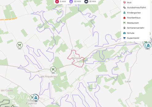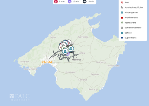 Die nächste Autobahnauffahrt zur Ma 13 liegt nur ca. 5 km entfernt und verbindet Sie zügig mit Palma sowie mit Orten entlang der zentralen Inselachse. Der Flughafen Palma de Mallorca ist je nach Verkehr in etwa 30 bis 40 Minuten mit dem Auto erreichbar. Auch der öffentliche Nahverkehr ist nutzbar, mit Busverbindungen Richtung Palma, sodass Sie flexibel bleiben.