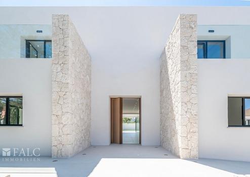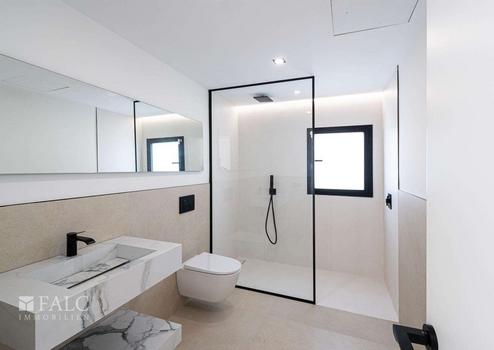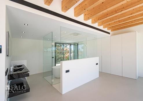 Die Villa verfügt über drei Schlafzimmer und drei Badezimmer, die durch klare Linienführung, hochwertige Materialien und zeitloses Design überzeugen. Das Master-Schlafzimmer im Obergeschoss bildet einen privaten Rückzugsort mit direktem Zugang zu einer großzügigen Sonnenterrasse – ideal, um den Tag unter mallorquinischer Sonne zu beginnen oder entspannt ausklingen zu lassen.