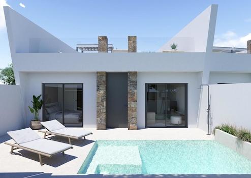 Moderne Neubau-Reihenhäuser mit privatem Pool im El Alba Resort Torre Pacheco~~Moderne Häuser in einer wachsenden mediterranen Ferienanlage~Diese Neubauanlage besteht in der ersten Phase aus nur 4 exklusiven Reihenhäusern und befindet sich im El Alba Mediterranean Resort in Torre Pacheco. Diese modernen Häuser sind auf einer Ebene konzipiert und bieten eine perfekte Kombination aus Komfort, Funktionalität und mediterranem Lebensstil im Freien.~~El Alba Resort ist ein aufstrebendes Wohngebiet, umgeben von weitläufigen Landschaften und Golfplätzen, nur wenige Kilometer von der Stadt Roldan entfernt, wo Sie Supermärkte, Restaurants, Banken und Dienstleistungen des täglichen Bedarfs finden. Das Resort verfügt bereits über einen Social Club mit Swimmingpool und Restaurant, und derzeit wird ein Gewerbegebiet entwickelt, das den Standort noch attraktiver und wertvoller macht.~~Ebenerdiges Wohnen mit privatem Garten und Solarium~Jede Immobilie verfügt über 2 Schlafzimmer und 2 Badezimmer, eines davon en suite, sowie eine offene Küche, die mit einem hellen Wohnzimmer verbunden ist. Der Grundriss wurde sorgfältig entworfen, um das natürliche Licht zu maximieren und eine nahtlose Verbindung zwischen Innen- und Außenbereichen zu schaffen.~~Alle Häuser verfügen über:~Voll ausgestattete Küche mit Geräten~Badezimmer mit Möbeln, Spiegel, Beleuchtung und Duschwänden~Einbauschränke mit Schubladen in den Schlafzimmern~Vorinstallation für eine Klimaanlage~LED-Beleuchtung im Innen- und Außenbereich~Drei Photovoltaik-Solarmodule mit einer Leistung von 1,5 kW pro Immobilie~~Die Außenbereiche sind so gestaltet, dass sie das ganze Jahr über genutzt werden können. Sie verfügen über einen privaten Garten mit Swimmingpool, eine Terrasse und ein großes privates Solarium mit einer Sommerküche, ideal für Mahlzeiten im Freien und zum Entspannen in der Sonne.~~Hochwertige Ausstattung für Komfort und Effizienz~Diese Häuser sind mit eleganten und funktionalen Innenräumen ausgestattet, wobei der Schwerpunkt auf Energieeffizienz und modernem Wohnen liegt. Ein privater Parkplatz befindet sich auf dem Grundstück und sorgt für Komfort und Sicherheit.~~Die Kombination aus Sonnenkollektoren, hochwertiger Isolierung und intelligentem Design sorgt für ein energieeffizientes Zuhause, das sich ideal für dauerhaftes Wohnen, Urlaub oder als Mietinvestition eignet.~~Ausgezeichnete Lage in der Nähe von Golfplätzen, Stränden und Flughäfen~Stadtzentrum von Roldan 2 km~Strände von Mar Menor 15 km~Strände am Mittelmeer 20 km~La Torre Golf Resort 5 km~Terrazas de la Torre Golf 6 km~Flughafen Murcia Corvera 18 km~Stadt Cartagena 30 km~~Diese strategisch günstige Lage ermöglicht einen einfachen Zugang zu Golfplätzen, Stränden, Dienstleistungen und Verkehrsanbindungen, während Sie gleichzeitig eine ruhige Wohnumgebung genießen können.~~Eine kluge Investition an der Costa Calida~Diese Reihenhäuser im El Alba Mediterranean Resort bieten eine ausgezeichnete Gelegenheit, eine moderne Immobilie mit privatem Pool in einer schnell wachsenden Gegend von Torre Pacheco zu erwerben.~~Kontaktieren Sie uns noch heute, um weitere Informationen zu erhalten oder einen Besichtigungstermin für diese exklusiven Neubauwohnungen zu vereinbaren.