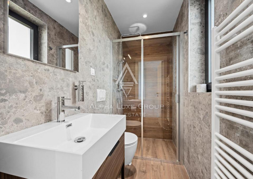 Der erste Stock ist dem täglichen Wohnen gewidmet und verfügt über einen großzügigen offenen Wohnbereich, der Wohnzimmer, Essbereich und moderne Küche miteinander verbindet. Große Glasfronten führen zu einer sonnigen Terrasse mit Whirlpool und beeindruckendem Meerblick. Eine zusätzliche Badezimmer sorgt für mehr Komfort.