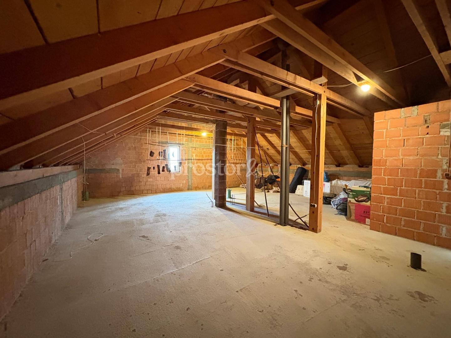 Das hohe Dachgeschoss wurde mit hochwertigen Verstärkungen und einer vollen Deckenhöhe von ca. 250 cm ausgeführt. Der niedrigste Punkt beträgt 147 cm, der höchste 296 cm. Der Raum ermöglicht den Ausbau zu einer zusätzlichen funktionalen Wohnung, einem Arbeitsbereich oder einer Erweiterung der unteren Etage, je nach Bedarf des zukünftigen Eigentümers.