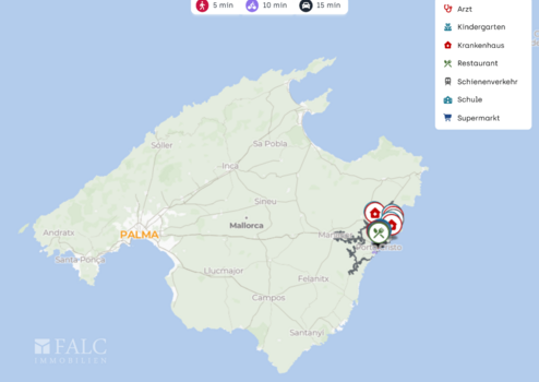 Die Anbindung an den öffentlichen Nahverkehr ist durch nahegelegene Busverbindungen im Ort gegeben. Der nächste Bahnanschluss befindet sich in Manacor und ist in ca. 15 bis 20 Minuten mit dem Auto erreichbar. Mit dem Auto erreichen Sie die überregionale Straßenanbindung über die Ma 15 in ca. 15 bis 20 Minuten. Der Flughafen Palma de Mallorca liegt je nach Verkehr in etwa 50 bis 60 Minuten Fahrzeit.