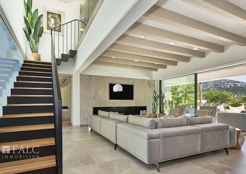 Diese luxuriöse Villa in Andratx ist mit Hausautomationssteuerung, elektrischen Rollläden, Gäste-WC, mehreren Kaminen, Natursteinböden, Fußbodenheizung per Wärmepumpe und vielen weiteren Annehmlichkeiten ausgestattet