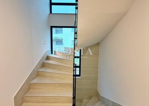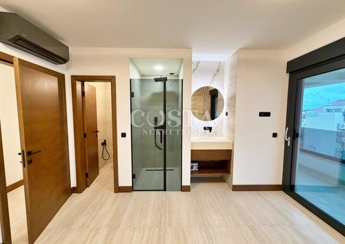 Für den Bau wurden hochwertige Materialien verwendet, darunter Stahlbetonkonstruktion, Aluminiumfenster und -türen mit Moskitonetzen und elektrischen Rollläden, erstklassige italienische Keramik sowie Travertin an Fassade und Innenwänden. Die Wohnung ist vollklimatisiert und verfügt über eine Fußbodenheizung mit Wärmepumpe.