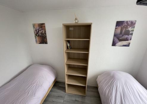 Das Zimmer ist mit zwei Einzelbetten ausgestattet, beide mit neuen Matratzen, die für einen erholsamen und bequemen Schlaf sorgen. Die praktische Raumaufteilung und das frische Ambiente machen diesen Raum zu einem vielseitigen und angenehmen Schlafzimmer.