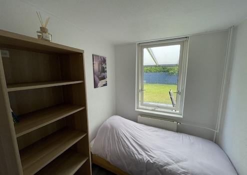 Schlafzimmer 2 befindet sich im Erdgeschoss und ist dadurch besonders komfortabel und leicht zugänglich – ideal für Kinder, Gäste oder alle, die Treppen vermeiden möchten. Das Fenster bietet einen schönen Blick in den Garten und sorgt für angenehmes Tageslicht sowie eine ruhige, grüne Atmosphäre.