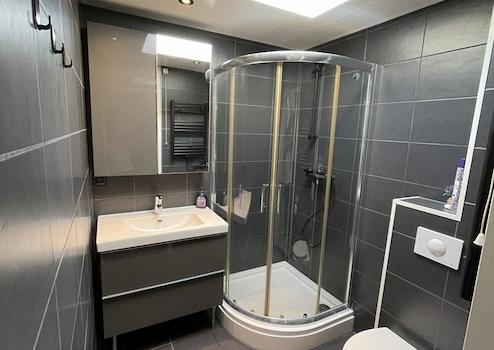 Das Badezimmer ist praktisch und komplett ausgestattet und bietet allen nötigen Komfort. Es verfügt über eine Duschkabine, ein WC sowie ein Waschbecken mit modernem Waschtischunterschrank und zusätzlichem Stauraum.