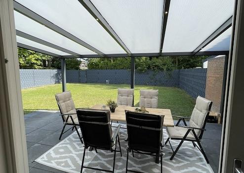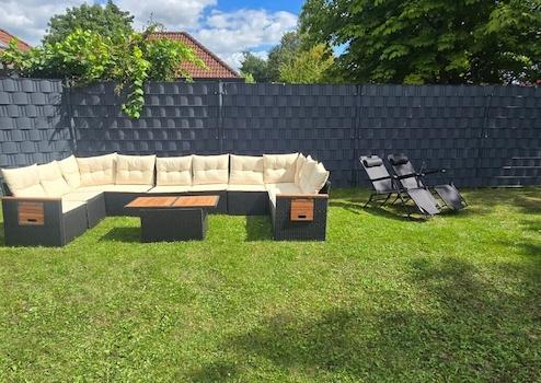 Es gibt ausreichend Platz für eine komfortable Sitzecke und einen gemütlichen Essbereich – perfekt für entspannte Stunden mit Familie und Freunden. Der Blick ins Grüne und die ruhige Umgebung schaffen eine angenehme Urlaubsatmosphäre zu jeder Jahreszeit.