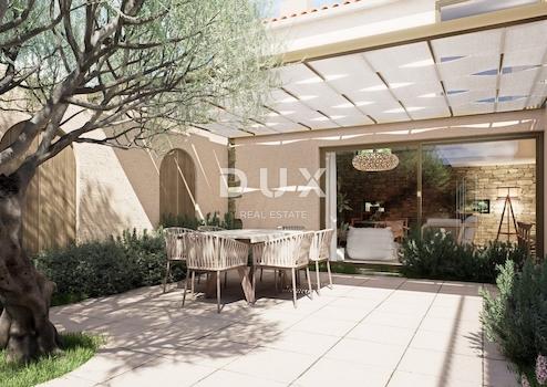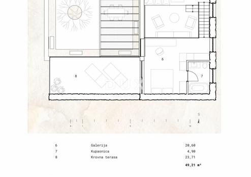 Ein erster Entwurf für die Sanierung verbindet traditionelle istrische Architektur mit modernem Interieur. Im Erdgeschoss sind ein großzügiger, offener Wohnbereich, eine Küche mit Essbereich, ein Schlafzimmer und ein Badezimmer geplant. Das Obergeschoss umfasst eine offene Galerie, ein weiteres Badezimmer und eine Terrasse. Alle Räume sind mit dem Innenhof verbunden und schaffen so ein harmonisches Gesamtbild von Innen und Außen.