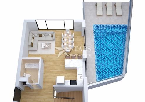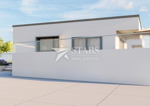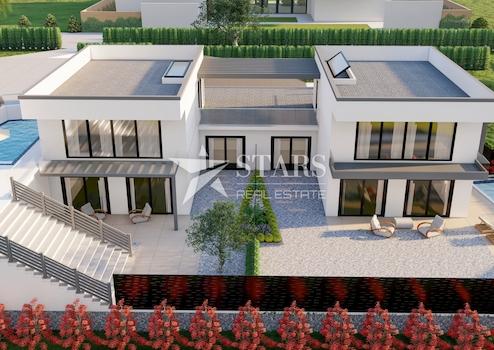 Im gepflegten Außenbereich ist ein Swimmingpool mit einer Fläche von 25 m² mit Sonnenterrasse und Jacuzzi geplant. Eine Außentreppe verbindet den Garten mit dem Untergeschoss. Das Haus wird mit Wärmedämmfassade, Flachdach, PVC-Fenstern, Klimaanlagen sowie elektrischer Fußbodenheizung ausgestattet und bietet somit hohen Wohnkomfort das ganze Jahr über. Zur Immobilie gehören zwei Parkplätze.