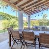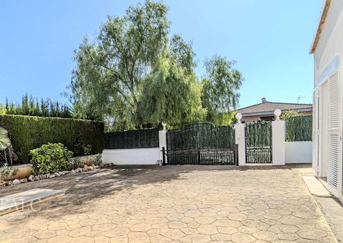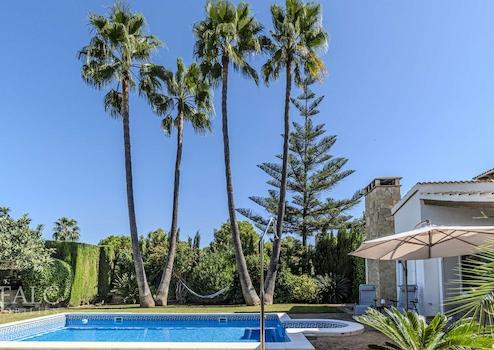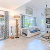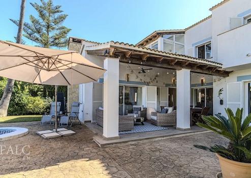 Der Außenbereich präsentiert sich als private Wohlfühloase: Ein gepflegter, mediterran angelegter Garten mit üppigem Grün und prächtigen Palmen umrahmt den einladenden Pool. Eine überdachte Terrasse sowie mehrere geschützte Lounge- und Entspannungsbereiche schaffen perfekte Rahmenbedingungen für stilvolles Outdoor-Living.