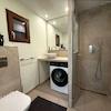 Das modern gestaltete Badezimmer überzeugt mit bodengleicher Dusche sowie integrierter Fußbodenheizung und vereint Komfort mit zeitloser Ästhetik.