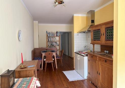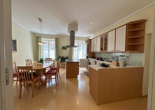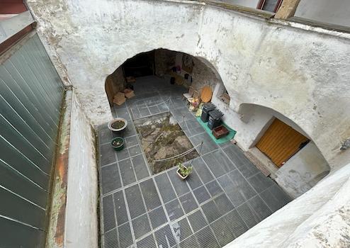 Im 1. Obergeschoss befindet sich die erste Wohnung mit Arkadengang sowie einem Garten / Innenhof. Bestehend aus einer voll eingerichteten Küche mit Essplatz (möbliert), einem Wohnzimmer, einem Schlafzimmer mit begehbarem Schrank und einem Gästezimmer oder Arbeitszimmer. Zudem noch Bad, WC und eine Speisekammer.