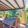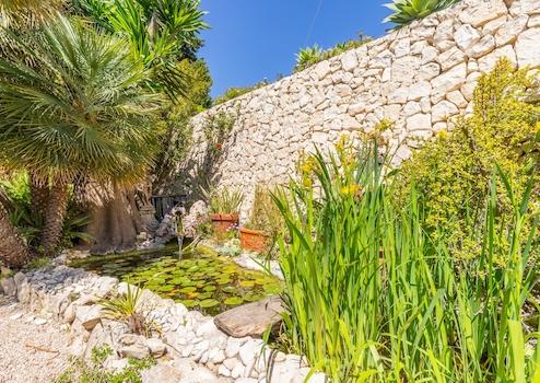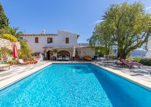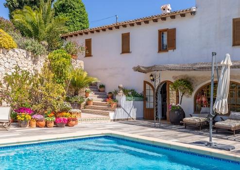 Das Anwesen besteht aus zwei Gebäuden: dem Haupthaus und dem Gästehaus. Der Ausblick ist wie aus dem Bilderbuch: Grüne Weinberge, das Meer und das Cap d'Or von Moraira im Hintergrund. Das Haus liegt an einem nach Südwesten ausgerichteten Hang und garantiert so den Genuss des milden Klimas der Region. Es ist vor Nordwinden geschützt und profitiert vom Südwind, der in den Sommermonaten als natürliche Klimaanlage wirkt. Das 154 m² große, rustikale und neu erbaute Gästehaus erstreckt sich über zwei Etagen. Es verfügt über drei Schlafzimmer, ein Wohn-Esszimmer und eine fantastische Terrasse, die den ganzen Sommer über Schatten spendet. Umgeben von einem Garten mit vielfältigen Pflanzen und Blumen bietet es einen herrlichen Ausblick, untermalt vom sanften Plätschern eines schönen Koiteichs. Mehrere Pergolen laden zum Verweilen und Genießen der Ruhe und Abgeschiedenheit des Anwesens ein. Zwischen den beiden Gebäuden erstreckt sich der Garten mit seiner üppigen Vegetation und einem von Palmen beschatteten Entspannungsbereich, der zum Poolbereich mit einer großzügigen Terrasse mit rutschfestem Boden führt. Mehr als 200 m² umgeben den Pool. Das Haupthaus ist ein Paradies für Ruhesuchende, denn es bietet verschiedene Bereiche, sodass man das ganze Haus genießen kann, ohne dass sich die Familienmitglieder gegenseitig stören.