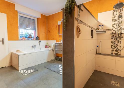 EG Tageslichtbad mit großer Walk-In- Dusche sowie separates WC mit Fenster. DG Tageslichtbad mit Dusche