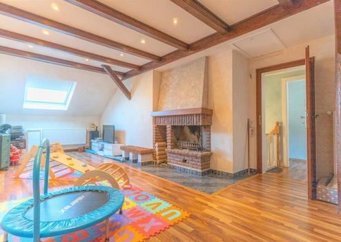 Im Dachgeschoss befindet sich auf der rechten Seite ein großzügiges Wohn-/ und Esszimmer mit offenem Kamin, das eine besonders angenehme Wohnatmosphäre schafft. Auf der linken Seite sind über eine Zwischendiele aktuell drei Schlafzimmer sowie ein ebenfalls modernes Tageslichtbad mit Dusche erreichbar. Im Falle einer Nutzung als Zweifamilienhaus kann eines der Schlafzimmer ohne größeren Aufwand zu einer Küche umgebaut werden.