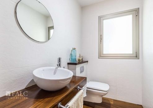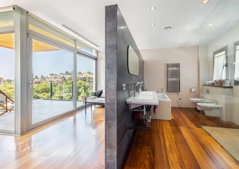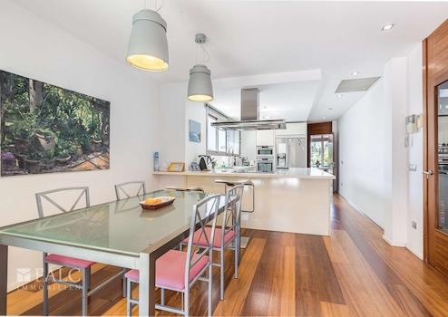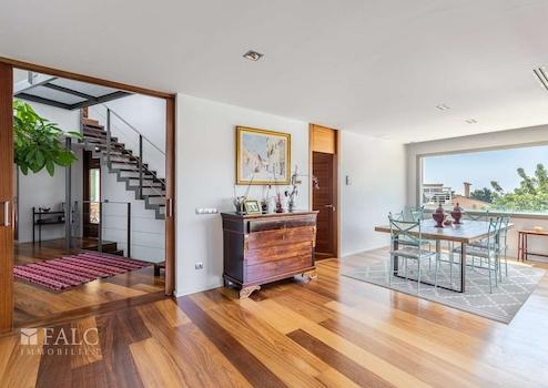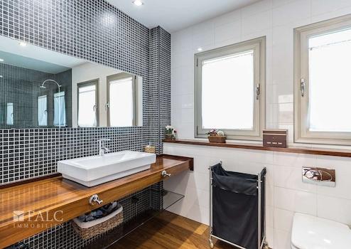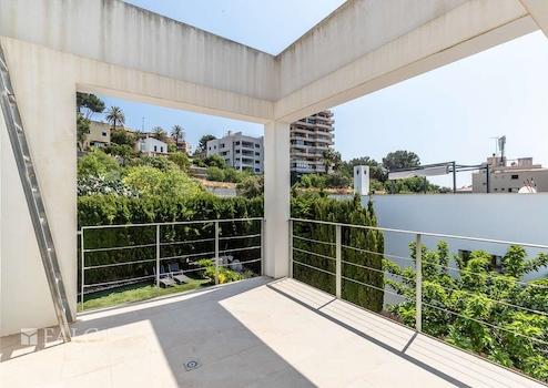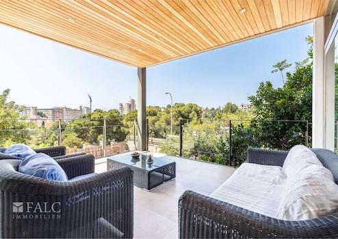 Diese herrliche moderne Villa in La Bonanova mit Teilmeerblick befindet sich in einem ruhigen und gefragten Viertel, nur wenige Minuten vom Zentrum Palmas entfernt. Die wunderbare, nach Süden ausgerichtete Immobilie bietet ein sonniges Grundstück von ca. 637 m2 und eine bebaute Fläche von ca. 444 m2, die sich wie folgt auf 3 Etagen verteilt: Im Hauptgeschoss befinden sich das helle Wohn-/Esszimmer mit Kamin, eine großartige offene Küche mit Zugang zu einer fantastischen Terrasse mit Grill und partiellem Meerblick, 2 Schlafzimmer mit Einbauschränken, eines davon mit Bad en suite. Durch die Küche erreichen wir den schönen Aussenbereich des Hauses mit Salzwasserpool und Garten. Das Obergeschoss bietet eine herrliche Aussicht und 3 Schlafzimmer, 2 davon mit Badezimmern en suite und jeweils einem Balkon. In der unteren Etage befinden sich eine Garage für 3 Autos und Stellplätze für 3 weitere Autos, ein Fitnessraum und ein Weinkeller. Extras: Parkettboden, Klimaanlage, Heizkörper, Abstellraum und vieles mehr. Es handelt sich um eine grüne und ruhige Wohngegend, nur wenige Autominuten von mehreren schönen Stränden und Buchten entfernt. Der exklusive Golfplatz von Son Vida ist nur 5 Autominuten entfernt.