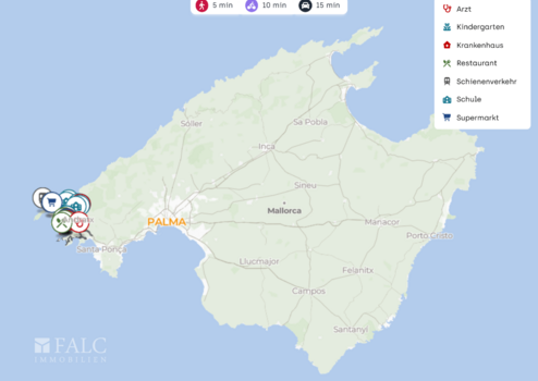 Eine Bushaltestelle wie Club de Vela oder Llotja ist in etwa ca 1 bis 2 km erreichbar und sorgt für eine praktische Anbindung im Ort und Richtung Palma. Mit dem Auto gelangen Sie zügig auf die Ma 1 in Richtung Palma. Der Flughafen Palma de Mallorca ist je nach Verkehr in etwa ca 35 bis 45 Minuten erreichbar.