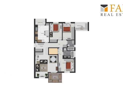 Das Apartment erstreckt sich vollständig über eine Etage und überzeugt durch eine klare, funktionale Raumaufteilung. Es verfügt über drei großzügige Schlafzimmer, ein zusätzliches kleines Zimmer, das sich ideal als Homeoffice, Gästezimmer oder ruhiger Rückzugsraum nutzen lässt, sowie über eine separate kleine Ankleide, die zusätzlichen Komfort und praktischen Stauraum bietet. Der Eingangsbereich fungiert als zentraler Verteiler und ermöglicht kurze Wege in alle Wohnbereiche. Die durchdachte Planung schafft ein angenehmes Wohngefühl und eignet sich ideal für Familien, als Erstwohnsitz, Feriendomizil oder auch als attraktive Kapitalanlage.