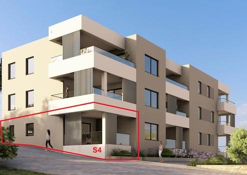 Die Wohnung S4 befindet sich im Erdgeschoss. Sie besteht aus zwei Schlafzimmern, einem Wohn-Esszimmer mit Küche, einem Badezimmer, einem Gäste WC mit Wascherei, einem Flur und einer überdachten Terrasse. Zur Wohnung gehören ein Abstellraum im Keller, ein Stellplatz (ein weiterer Stellplatz kann noch erworben werden) und ein eigener kleine Garten.