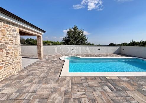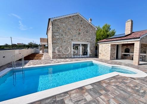 In Vrsi bei Zadar steht eine neu erbaute Steinvilla zum Verkauf. Das Anwesen mit einer Wohnfläche von 165 m² befindet sich auf einem 394 m² großen Grundstück und besteht aus Erdgeschoss und Obergeschoss. Im Erdgeschoss befinden sich ein geräumiges Wohnzimmer, eine Küche mit Essbereich und Kamin, ein Schlafzimmer und ein Badezimmer. Das Obergeschoss verfügt über drei Schlafzimmer mit jeweils eigenem Bad. Vom Wohnzimmer gelangt man auf eine gepflasterte Terrasse mit beheiztem Pool, Sommerküche und Abstellraum sowie zum Garten und einem privaten Parkplatz.
