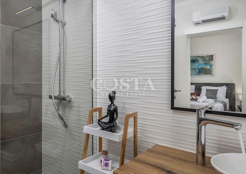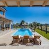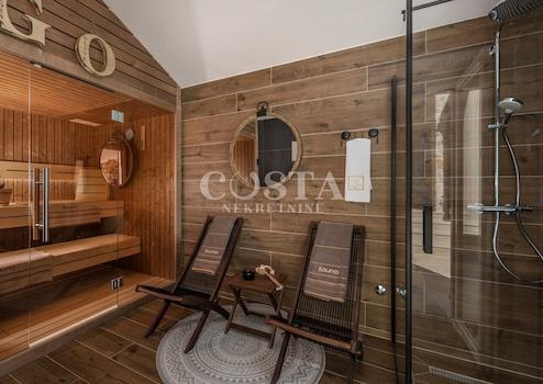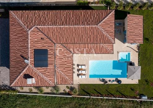 Angrenzend an die Villa befindet sich ein Nebengebäude mit einem Wellnessbereich inklusive Sauna. Vom Wohnzimmer im Erdgeschoss gelangt man auf eine überdachte Terrasse mit Lounge-Bereich und Sommerküche mit Grill. Im großzügigen Innenhof befinden sich ein 32 m² großer Pool, ein Whirlpool, eine Liegewiese, ein Garten und ein privater Parkplatz. Alle Räume sind klimatisiert, und das Anwesen verfügt zudem über eine 12-kW-Photovoltaikanlage zur Stromerzeugung.