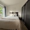 Vom Wohnzimmer aus gelangen Sie in das Elternschlafzimmer, das mit einem Doppelbett und einer Schrankwand ausgestattet ist. Dieses Zimmer verfügt über Flügeltüren, die auf eine kleine Terrasse führen.