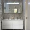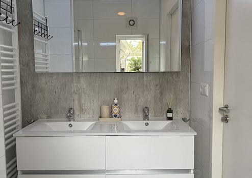Das Badezimmer ist mit einem guten Abzug und einem Dreh-Kipp-Fenster mit Insektenschutzgitter, einem Design-Handtuchheizkörper, einem beleuchteten Spiegel sowie einem Doppelwaschbecken mit zwei Schubladen ausgestattet.