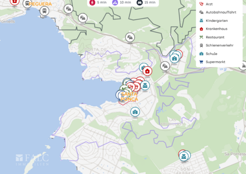 Für Freizeit und Bewegung bietet die Umgebung attraktive Möglichkeiten: Der Golfplatz Golf Santa Ponça I ist in wenigen Minuten mit dem Auto erreichbar, und mit dem Poliesportiu de Santa Ponça steht eine Sportanlage in der Nähe zur Verfügung. Grünflächen und ein Park in der Umgebung runden die Lage ab und schaffen zusätzliche Aufenthaltsqualität im Freien.