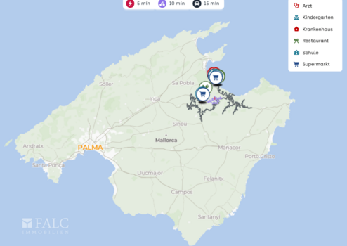 Die Immobilie liegt in ruhiger Umgebung bei Santa Margalida und verbindet entspannte Privatsphäre mit einer alltagstauglichen Infrastruktur. Für den täglichen Bedarf erreichen Sie Einkaufsmöglichkeiten wie Lidl in ca. 4 km, ebenso sind weitere Versorger wie Mercadona in ähnlicher Entfernung vorhanden. Frische Backwaren bekommen Sie bei Gelabert in ca. 5 km, und für den schnellen Kaffee zwischendurch bietet sich zum Beispiel es Revolt in ca. 4 km an.