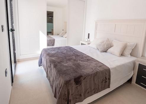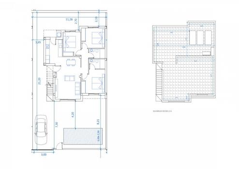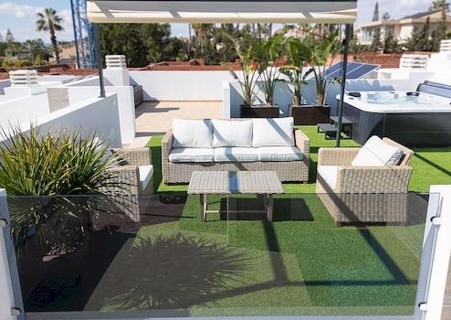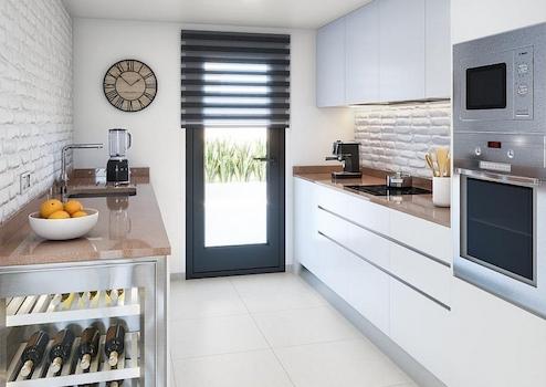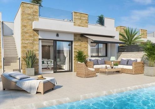 Diese einstöckigen Häuser verfügen über drei Doppelschlafzimmer (alle mit Einbauschränken), zwei Badezimmer (eines davon en-suite), eine voll ausgestattete moderne Küche und ein offenes Wohn-/Esszimmer, das zum privaten Garten mit Swimmingpool führt. Eine Treppe führt hinauf zu einer großen privaten Dachterrasse mit herrlichem Blick. Es gibt einen Parkplatz auf dem Grundstück.