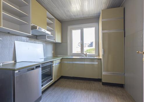 Die Küche misst ca. 8 m² und verfügt über eine L-förmige Küchenzeile mit folgender Ausstattung: Elektroherd, Dunstabzug, Geschirrspüler, Backofen und Kühlschrank.