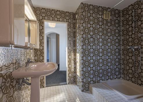Das komplett geflieste Badezimmer ist ca. 8 m² groß und ausgestattet mit Badewanne, Dusche, Waschbecken und WC.