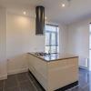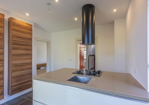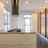 Die geschlossene Küche (ca. 14 m²) verfügt über eine geradlinige Einbauküche mit Kochinsel und ist mit folgenden Geräten ausgestattet: 4-Flammen-Gasherd, Designer-Dunstabzugshaube, Kombi-Mikrowelle, Kühlschrank und Geschirrspüler. Von der Küche aus gelangt man direkt in den rückwärtigen Gartenbereich, der nach Nordosten ausgerichtet ist und sich auf Kellerniveau befindet.