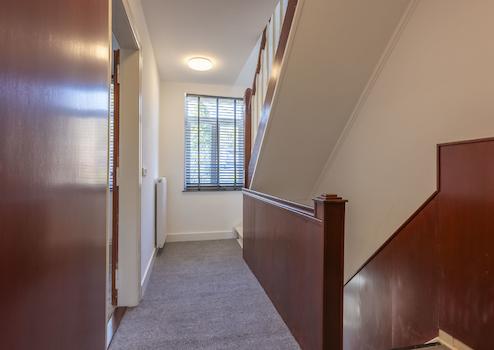 Vom Treppenabsatz aus erreicht man zwei Schlafzimmer mit ca. 19 m² und 12 m², jeweils mit Teppichboden ausgestattet. Ein Einbauschrank auf dem Flur bietet zusätzlichen Stauraum und beherbergt die Zentralheizungsanlage.