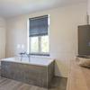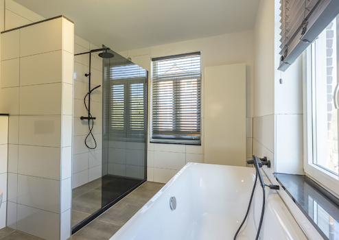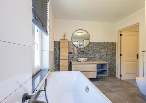 Das moderne Badezimmer (ca. 10 m²) ist teilweise gefliest und verfügt über eine Badewanne, eine begehbare Dusche, ein Waschbecken sowie eine wandhängende Toilette.