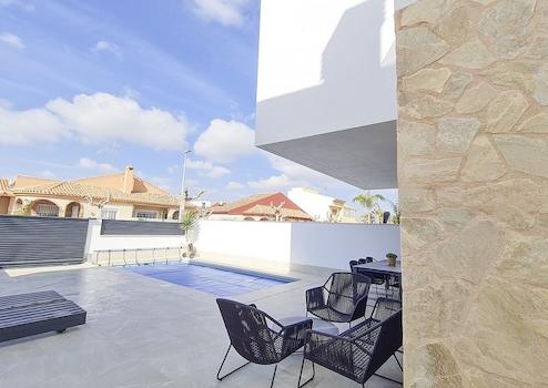 Willkommen in dieser exklusiven Villa im Herzen von San Pedro del Pinatar, einer beliebten Küstenstadt am Mar Menor und am Mittelmeer. Die Villa verfügt über drei Schlafzimmer, drei Badezimmer, einen privaten Swimmingpool und einen Parkplatz auf eigenem Grundstück und bietet damit höchsten Komfort für dauerhaftes Wohnen oder entspannte Ferien.