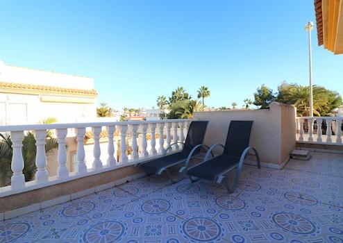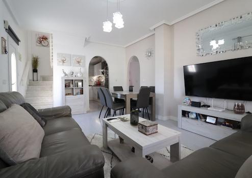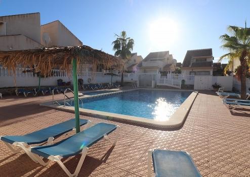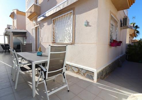 Diese gepflegte und schön gestaltete Villa befindet sich auf einem Eckgrundstück und bietet komfortables Wohnen auf zwei Ebenen. Das Erdgeschoss besteht aus einem hellen Wohn-/Esszimmer mit einem Pelletofen, der für zusätzliche Wärme und Charme sorgt. Auf dieser Ebene befinden sich außerdem eine separate, gut ausgestattete Küche, ein Duschbad und zwei Doppelschlafzimmer. Im Obergeschoss befindet sich das Hauptschlafzimmer mit eigenem Duschbad und Zugang zu einer privaten Terrasse, die auch vom Flur aus zugänglich ist und einen angenehmen Außenbereich zum Entspannen bietet. Der Garten ist vollständig gefliest, was die Pflege erleichtert, und verfügt über einen überdachten Parkplatz abseits der Straße. Die Bewohner haben außerdem Zugang zu einem gepflegten Gemeinschaftspool. Diese attraktive freistehende Villa verfügt außerdem über eine Klimaanlage im Wohnzimmer und im Hauptschlafzimmer und bietet eine großartige Kombination aus Lage, Platz und Funktionalität, was sie ideal als Dauerwohnsitz, Ferienimmobilie oder Investitionsmöglichkeit an der Costa Blanca Süd macht.