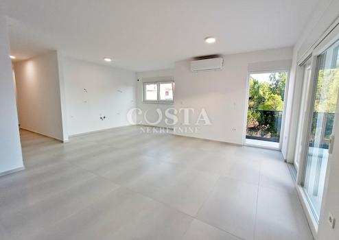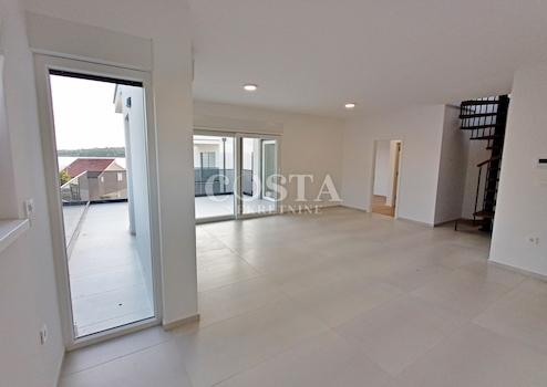 In Vodice bei Šibenik steht ein Penthouse in einem Neubau zum Verkauf. Die 96,69 m² große Wohnung befindet sich im zweiten Obergeschoss eines kleinen Wohnhauses mit nur acht Wohneinheiten. Sie besteht aus einem geräumigen Wohnzimmer, einer Wohnküche, drei Schlafzimmern, zwei Badezimmern, einem Gäste-WC, einem Flur und einer überdachten Terrasse von zusätzlich 24,46 m². Zur Wohnung gehören außerdem ein 103,10 m² großer Teil der Dachterrasse sowie ein Außenstellplatz im Innenhof. Die Gesamtnutzfläche der Wohnung inklusive aller Nebenkosten beträgt 236,75 m² (170,34 m² Nutzfläche).