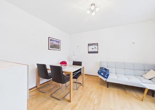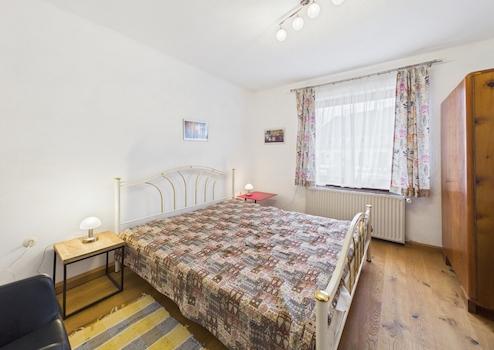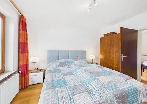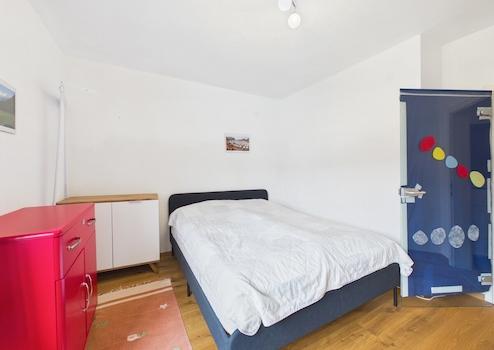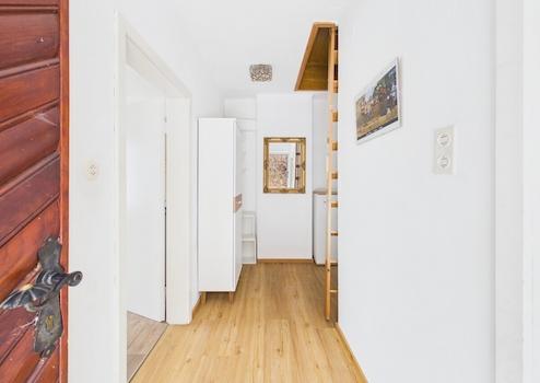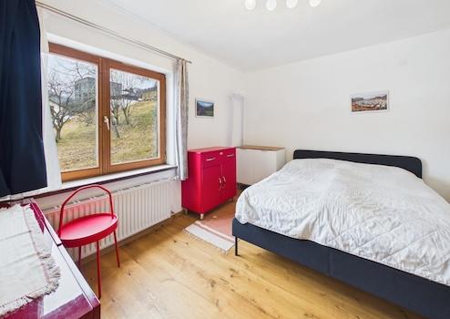 Im Obergeschoss stehen zwei Schlafzimmer, ein Badezimmer, eine Küche, ein Wohn-/Esszimmer sowie ein WC zur Verfügung.