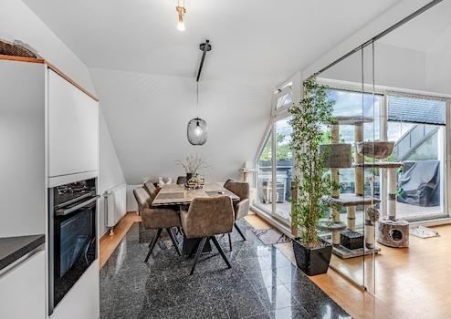 Diese Maisonette-Wohnung erstreckt sich über das 2. Obergeschoss sowie das ausgebaute Galeriegeschoss einer gepflegten Wohnanlage am Rande eines Naturschutzgebiets. Mit einer Wohnfläche von ca. 107 m², zwei Balkonen, einer beeindruckenden Raumhöhe durch die offene Galerie und einer hochwertigen Ausstattung bietet diese Immobilie außergewöhnlichen Wohnkomfort – sowohl für Kapitalanleger als auch für Eigennutzer mit Anspruch. Der Zugang zur Wohnung erfolgt über das 2. Obergeschoss. Hier eröffnet sich ein großzügiger Wohnbereich mit Zugang zum großen Balkon in Westausrichtung. Über ein großes Schiebetürelement gelangen Sie ins Freie. Die Küche und der Essplatz sind durch eine elegante Glasschiebetür vom Wohnraum separiert. Die moderne Einbauküche wurde erst im vergangenen Jahr von