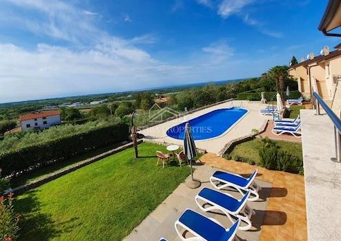 Eine Außentreppe führt hinunter in den grünen Garten mit einem großen Gemeinschaftspool und einem atemberaubenden Panoramablick auf das Meer und die mediterrane Landschaft sowie einer privaten Taverne mit Kamin. Diese kann auf Wunsch der zukünftigen Eigentümer in ein praktisches Studio-Apartment mit bereits geplanten Installationen umgewandelt werden.