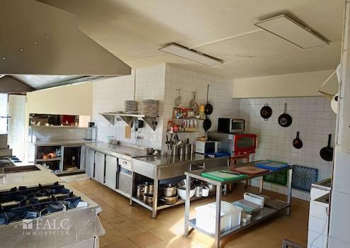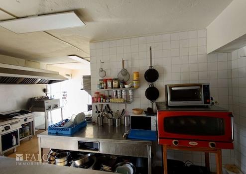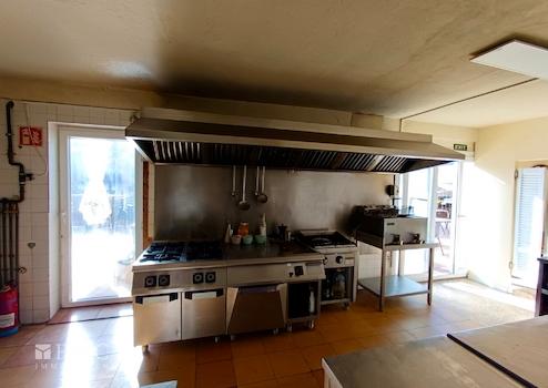 Der Innenbereich umfasst einen Gastraum mit Theke/Bar, eine Küche, zwei Abstellräume sowie eine vierte, kleinere überdachte Terrasse, angrenzend zum Gastraum.