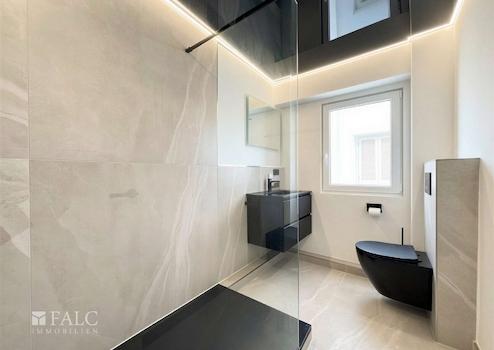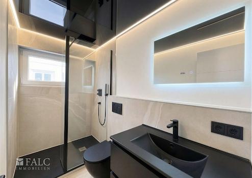 Die Bäder sind modernisiert und in einem modernen Stil gehalten. Klare Formen, eine bodengleiche Dusche mit Glasabtrennung sowie dunkle Armaturen unterstreichen den zeitgemäßen Charakter.