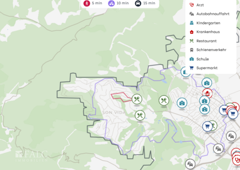 Die Anbindung an den öffentlichen Nahverkehr ist komfortabel: Die Bushaltestelle Marola liegt in ca. 0,1 km, weitere Haltestellen wie Turixant - Boscana und Son Vida sind in ca. 0,3 km erreichbar. Mit dem Auto gelangen Sie zügig zur nächsten Autobahnauffahrt in ca. 3 km, was Wege in und um Palma deutlich erleichtert. Der Flughafen Palma de Mallorca ist je nach Verkehr in etwa 20 bis 25 km erreichbar.