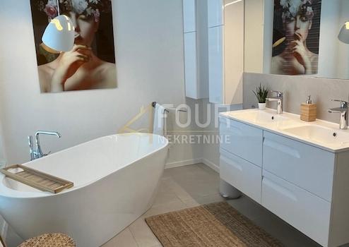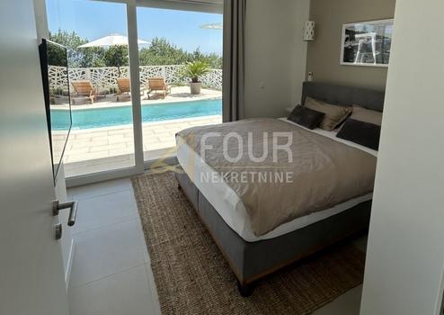 Im Obergeschoss befinden sich eine Küche mit Esszimmer, ein Wohnzimmer mit Kamin und ein geräumiges Hauptschlafzimmer mit eigenem Bad. Von der Küche aus gelangt man auf einen kleinen Balkon, während der gesamte Wohnbereich mit großen Glasfronten ausgestattet ist, die einen offenen Blick auf das Meer, die Insel Cres und den Kvarner bieten. Im Erdgeschoss befinden sich drei Schlafzimmer, jedes mit eigenem Bad und Zugang zu einer großen Terrasse. Auf der Terrasse befinden sich ein Pool mit Strahler und Gegenstromanlage sowie ein Whirlpool, die einen idealen Raum für Entspannung und Genuss in völliger Privatsphäre schaffen. Auf dem gepflegten Grundstück befinden sich neben dem Pool eine Außendusche, eine Sommerküche und ein Grill.
