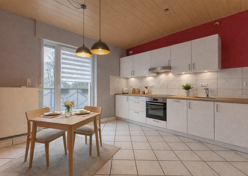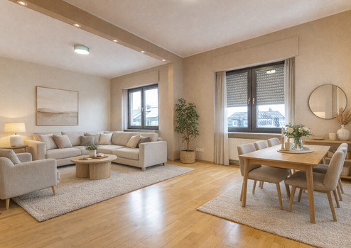 Ebenfalls von der Diele aus erreichbar ist der Wohn-/ und Essbereich, der sich rechts neben der Küche befindet. Der Raum bietet ausreichend Stellfläche für eine geräumige Wohnlandschaft sowie einen separaten Essbereich.